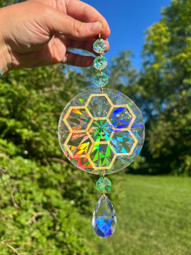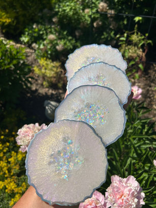 My main media is high-quality poured resin embellished with crystals, pressed flowers, shells, metallic elements, and glitter. Each unique piece takes its shape via silicone molds, wood, canvas, or metal. My passion for creativity has inspired a multitude of goods- from space brightening homewares including suncatchers, drink coasters, magnets, wall art, jewelry boxes, and statement piece tables-to wearable arts like hair clips and jewelry